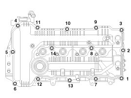 (4) Install the cylinder head cover (A) by tightening the bolts, in several passes, in the sequence as shown.