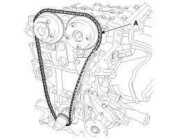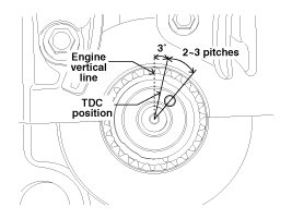 2. Turn the crankshaft clockwise (about 2 - 3 pitches) from the TDC position (the dowel pin (A) of crankshaft is about 3° with the engine vertical line) as rotation of the intake CVVT sprocket from the TDC position.