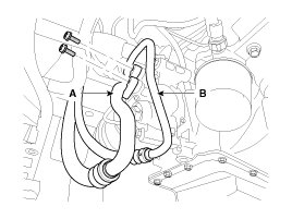 5. Remove the bolts, then disconnect the suction line (A) and discharge line (B) from the compressor. Plug or cap the lines immediately after disconnecting them to avoid moisture and dust contamination.