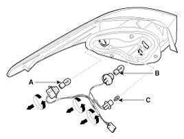 5. Replace the stop lamp(A), the tail lamp(B) and turn signal lamp(C) by turning the sockets counterclockwise.