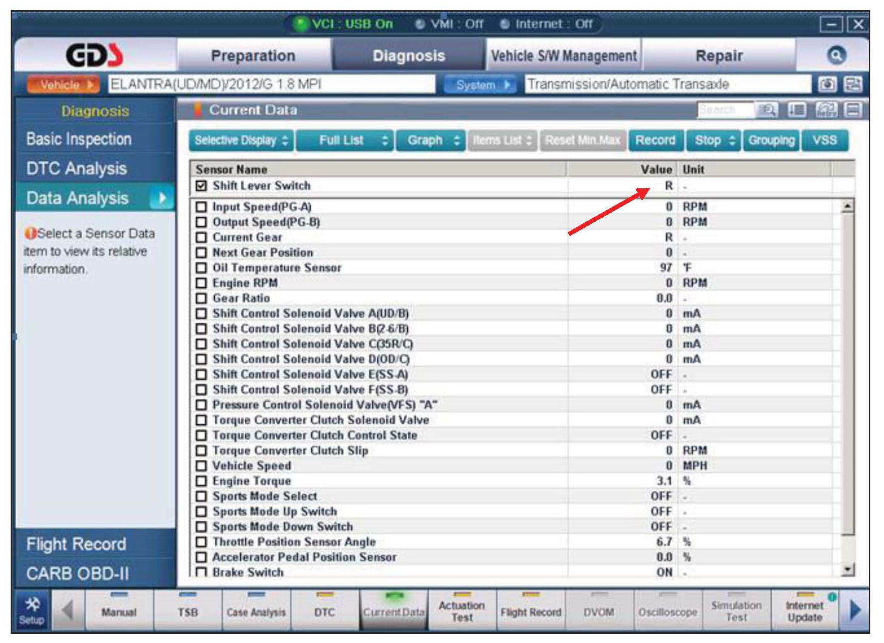 3. Select the following parameters. Move the shift lever through all gears and monitor the sensors.