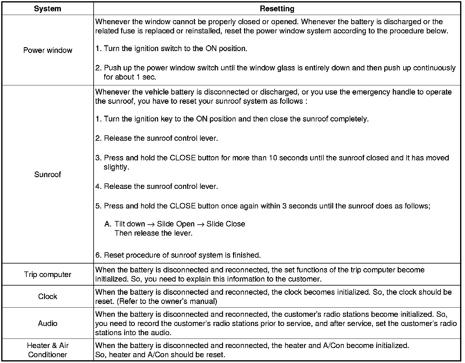 When reconnecting the battery cable after disconnecting, recharging battery after discharged or installing the memory fuse located on the driver's side panel after removing, be sure to reset systems mentioned in the below table.