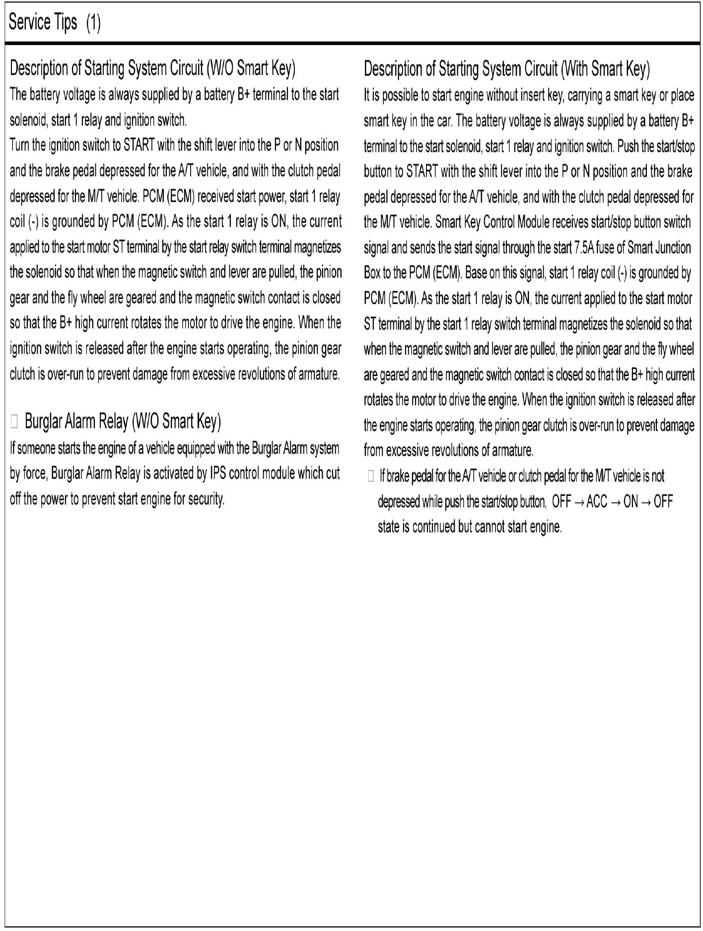 The starting system includes the battery, starter, solenoid switch, ignition switch, inhibitor switch (A/T), ignition lock switch, connection wires and the battery cable.