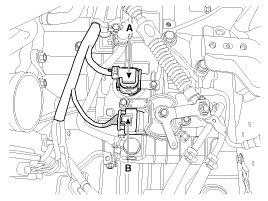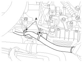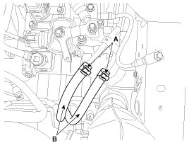 5. Disconnect the hose (B) after removing the automatic transaxle fluid cooler hose clamp (A).