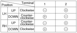 4. Connect the motor terminals directly to battery voltage (12V) and check that the motor operates smoothly. Next, reverse the polarity and check that the motor operates smoothly in the reverse direction. If the operation is abnormal, replace the motor.