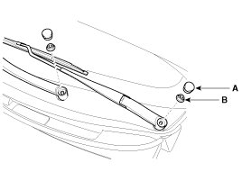 1. Loosen the windshield wiper arm nut (B) after removing a wiper cap (A).