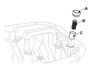 Install relief plunger(C) and spring(B) into the front case hole, and install the plug(A).