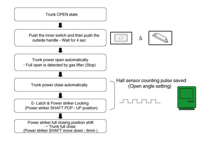 Parameterization of the system has to be performed to find the amount of pulses needed to open the trunk. Due to tolerances not every car is equal. Therefore the calibration is needed for each vehicle. Parameterization is started by pressing Trunk Inner switch and Trunk Outer switch at the same time for approx. 4 seconds. The trunk then will open until a blocking event is detected (normally full open position) and then close until it reaches the latch. During closing the HALL pulses are counted to know the travel distance. This value is stored into EEPROM.