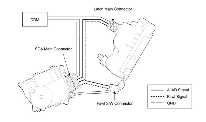 Following is a diagram of the driver's side door lock and power latch units. DDM monitors power door latch lock/unlock activation power and switch statuses (lock/unlock switch and door key switch), and the power latch feature is signal-operated.