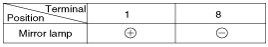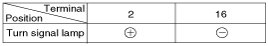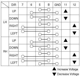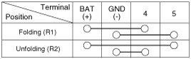 3. Apply battery voltage to each terminal as shown in the table and verify that the mirror operates properly.
