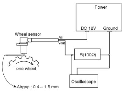 In order to protect the wheel speed sensor, when measuring output voltage, a 100 Ohms resister must be used as shown.