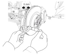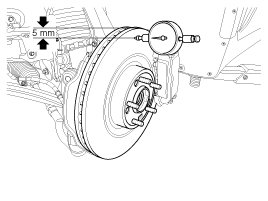 1. Place a dial gauge about 5mm (0.2 in.) from the outer circumference of the brake disc, and measure the runout of the disc.