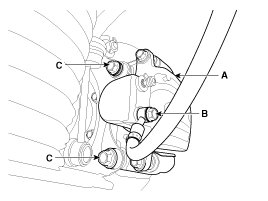 2. Loosen the hose eye-bolt (B) and caliper mounting bolts (C), then remove the rear caliper assembly (A).