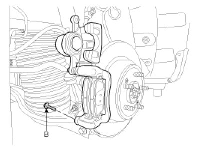 1. Loosen the guide rod bolt (B) and pivot the caliper up out of the way.