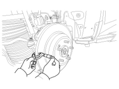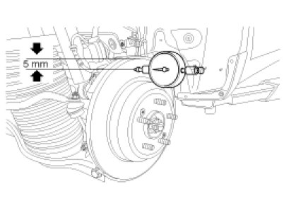 1. Place a dial gauge about 5mm (0.2 in.) from the outer circumference of the brake disc, and measure the runout of the disc.