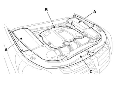 2. Remove the engine room cover (A), engine cover (B) and radiator grill upper cover (C).