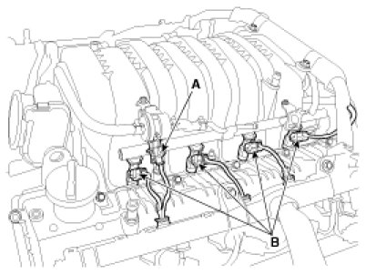 6. Disconnect the purge control solenoid valve (PCSV) connector (A) and the injector connectors (B).