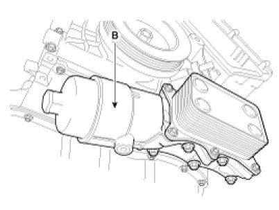 9. Remove the oil filter & cooler assembly (B).