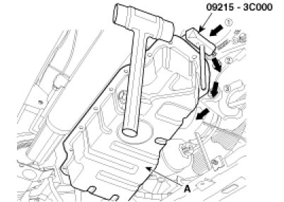 Insert the blade of SST(09215-3C000) between the upper oil pan and the lower oil pan. Cut off applied sealer and remove the lower oil pan.
