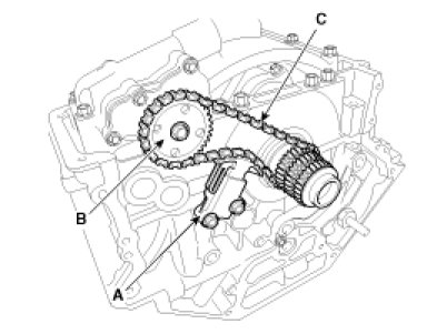 3. Install the oil pump chain (C) with the oil pump sprocket (B) and oil pump chain tensioner (A).