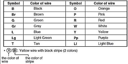 The following abbreviations are used to identify wire colors in the circuit schematics.