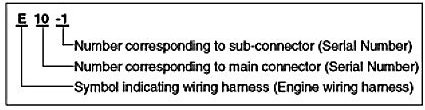 A Connector identification symbol consists of a wiring harness location classification symbol corresponding to a wiring harness location and number corresponding to the connector.