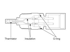 The electrical resistance of the ECTS decreases as the temperature increases, and increases as the temperature decreases. The reference +5V is supplied to the ECTS via a resistor in the ECM. That is, the resistor in the ECM and the thermistor in the ECTS are connected in series. When the resistance value of the thermistor in the ECTS changes according to the engine coolant temperature, the output voltage also changes.