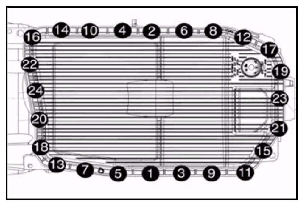 16. Install the oil pan and tighten the bolts to specification in the order shown.