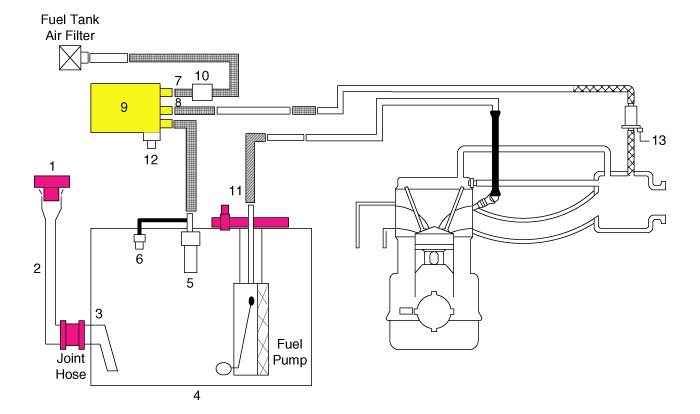 This system consists of a fill vent valve, fuel shut-off valve, fuel cut valve (for roll over), two way valve (pressure/vacuum relief), fuel liquid/vapor separator which is installed beside the filler pipe, charcoal canister which is mounted under the rear floor LH side member and protector, tubes and miscellaneous connections.