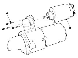 2. Disconnect the starter cable (A) from the B terminal on the solenoid, and the connector (B) from the S terminal.