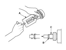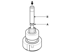 Using a suitable pulling tool (A), pull the overrunning clutch stopper (B) over the stop ring (C).