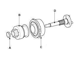 12. Disconnect the stopper (A), overrunning clutch (B), internal gear (C) and planet shaft (D).