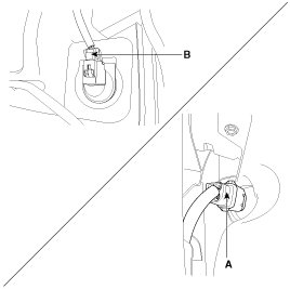 4. Remove the washer hose and the washer motor connector (A) and the washer fluid level sensor connector(B).