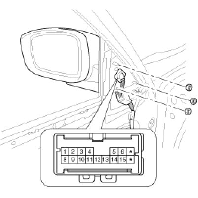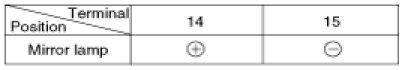 3. Apply battery voltage to each terminal as shown in the table and verify that the mirror operates properly.