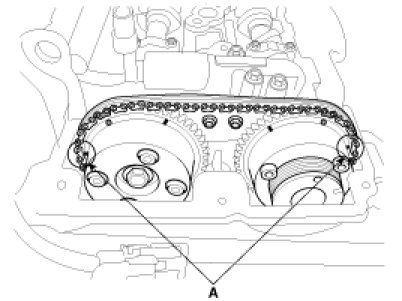 (2) Check that the mark (A) of the camshaft timing sprockets are in straight line on the cylinder head surface as shown in the illustration. If not, turn the crankshaft clockwise one revolution (360°).