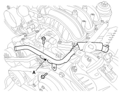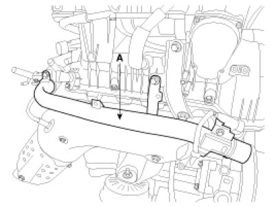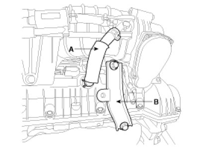 16. Remove the PCV hose (A) and surge tank stay (B).