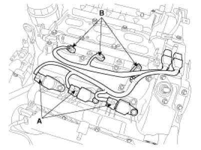 18. Disconnect the RH ignition coil connector (A) and the injector connector (B).