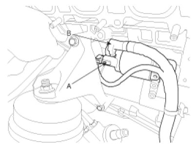 9. Loosen the engine mounting nut (A) and remove the engine mounting bracket (B).