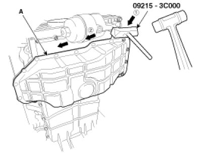Insert the blade of SST(09215-3C000) between the upper oil pan and the lower oil pan. Cut off applied sealer and remove the lower oil pan.