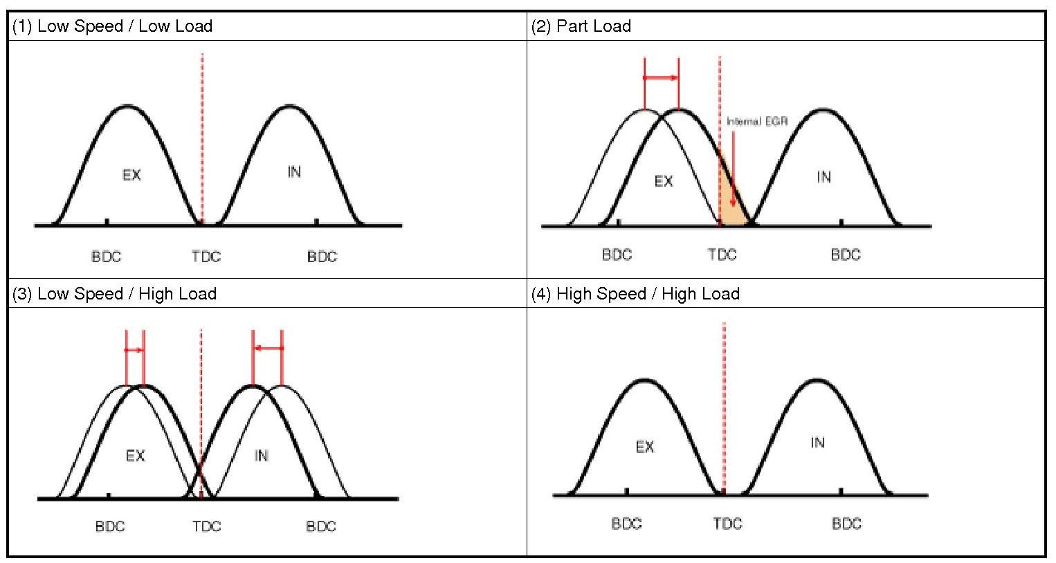 By controlling CVVT, the valve over-lap or under-lap occurs, which makes better fuel economy and reduces exhaust gases (NOx, HC). CVVT improves engine performance through reduction of pump loss, internal EGR effect, improvement of combustion stability, improvement of volumetric efficiency, and increase of expansion work.