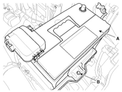 4. Disconnect the battery positive terminal and then remove the battery (A).