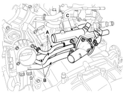 11. Disconnect the throttle body coolant hoses (A), oil cooler coolant hoses (B) and then remove the water temperature control assembly (C).