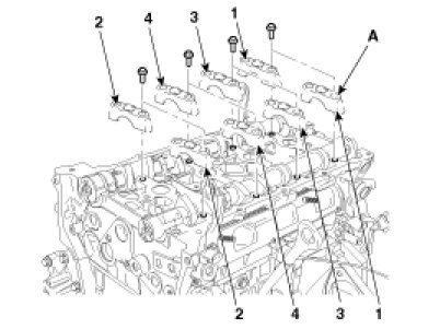 (3) Remove the camshaft bearing cap (A), in the sequence shown.