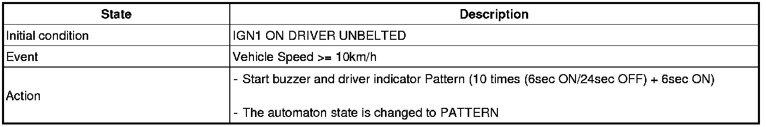 In the state that the IGN1 is ON or the Parking Brake is pulled, if the speed of vehicle is maintained over 10 km/h for 2 - 3 seconds or more, then the Chime Buzzer output shall be continued with 1 second cycle of the ON/OFF (0.3/0.7 seconds). But, after the speed of vehicle is maintained over 10 km/h for 2 - 3 seconds or more, if the Parking Brake is pulled, output immediately.