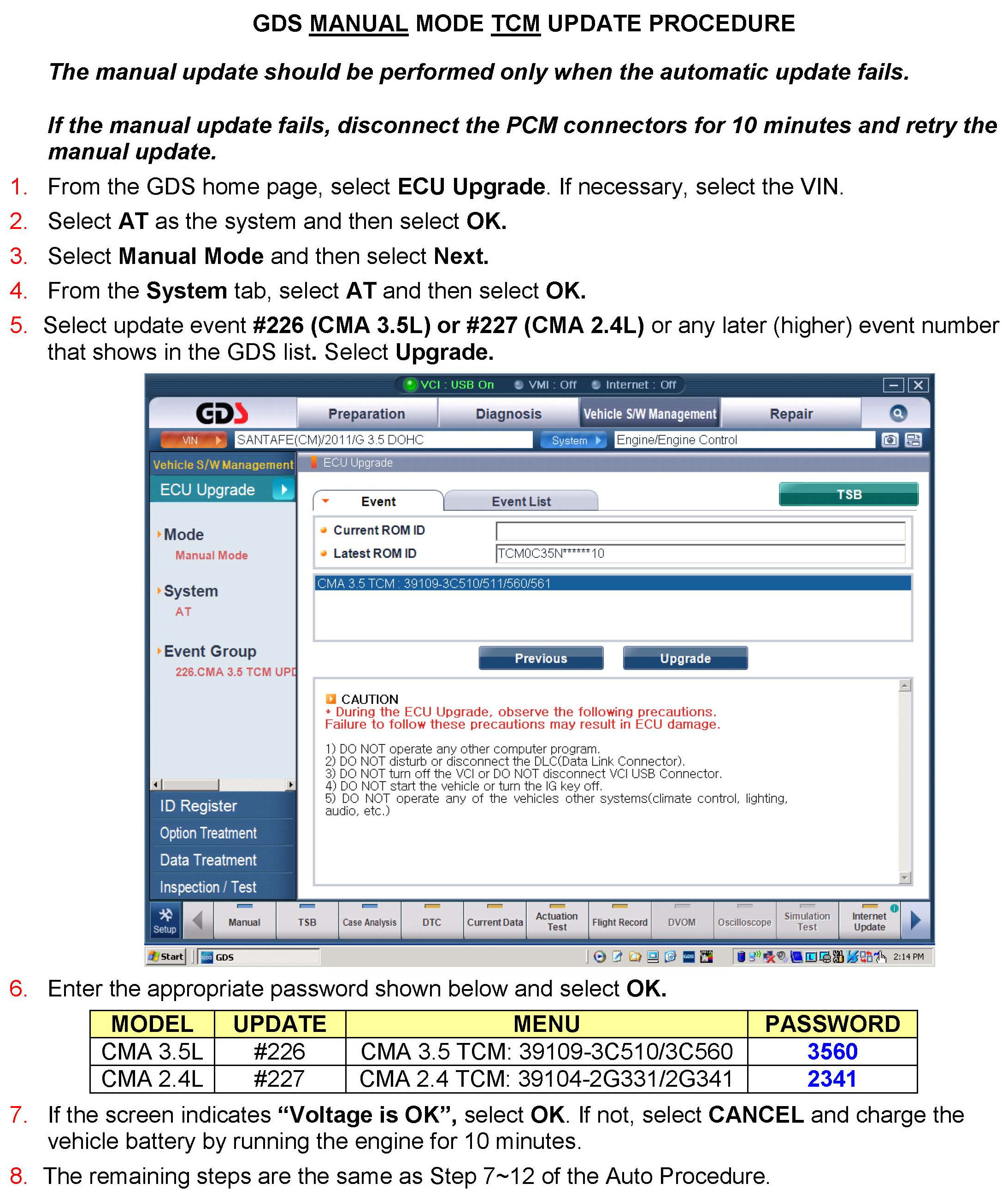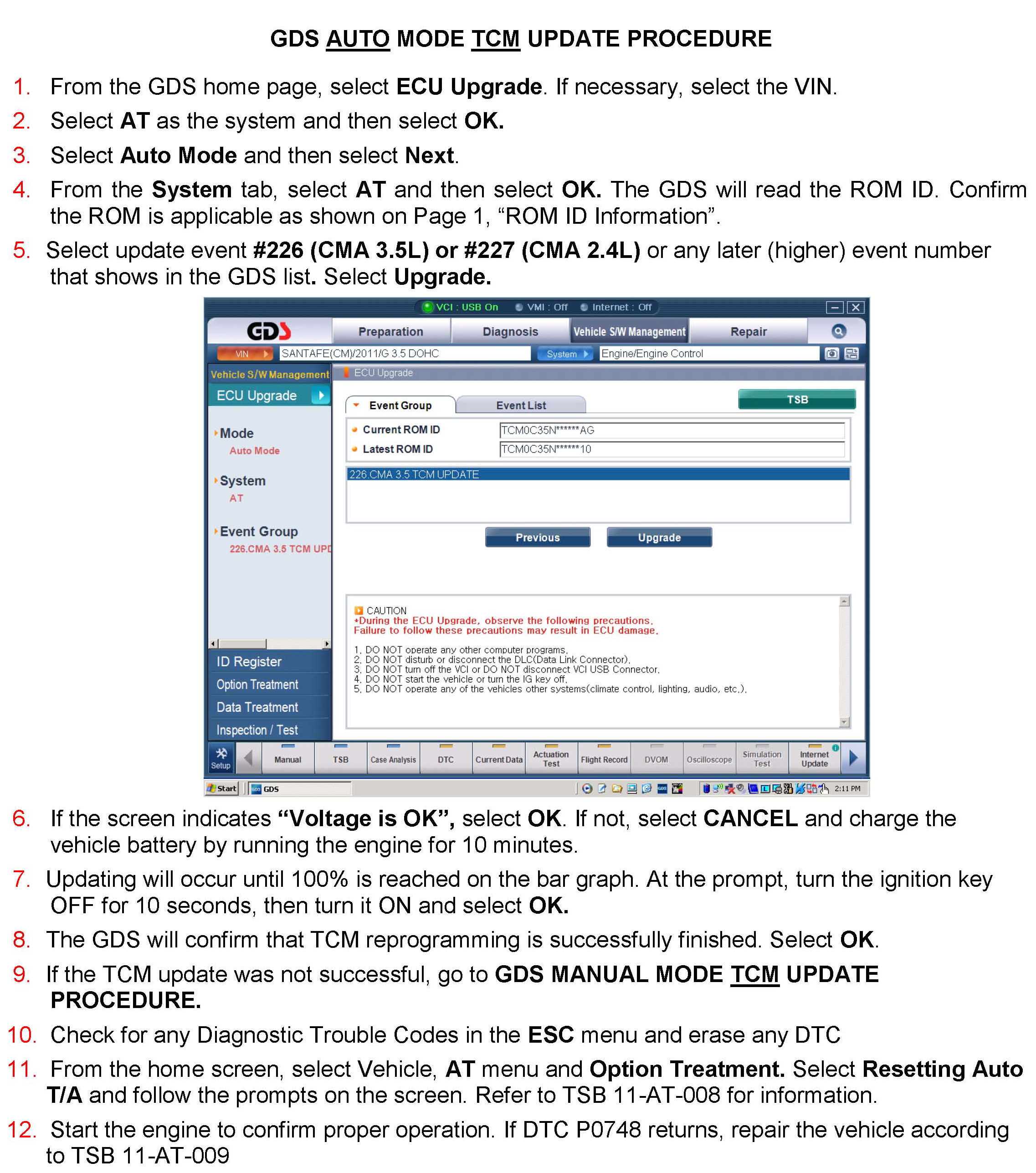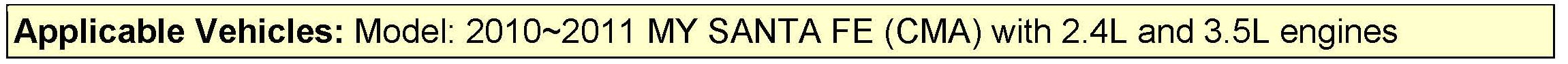 This bulletin provides a procedure to update the TCM for 2010~11 Santa Fe (CMA) 2.4L & 3.5L vehicles with automatic transaxles. The update includes: