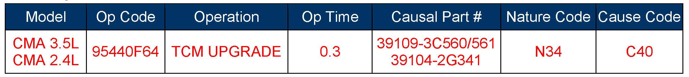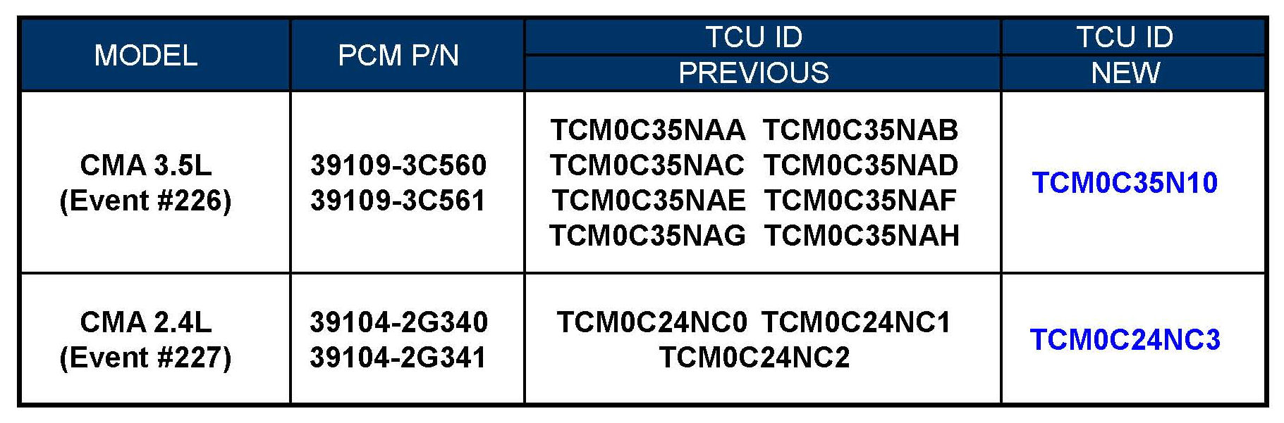 Verify the TCM ROM ID before updating the vehicle's software. Refer to the table.