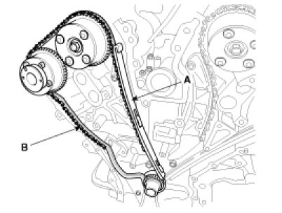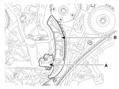 40. Remove the LH timing chain guide (A) and LH timing chain (B).