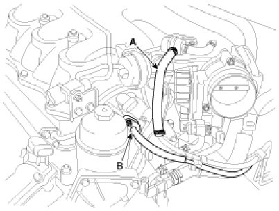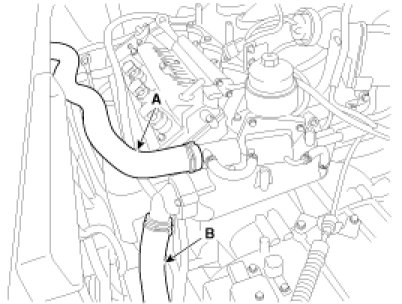 7. Remove the radiator upper hose (A) and lower hose (B).