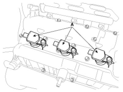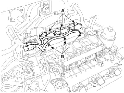 15. Disconnect the RH ignition coil connectors (A) and the RH injector connectors (B).