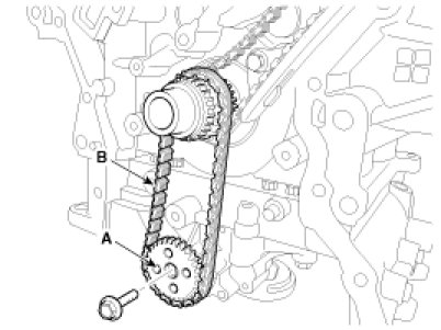 36. Remove the oil pump chain sprocket (A) and oil pump chain (B).